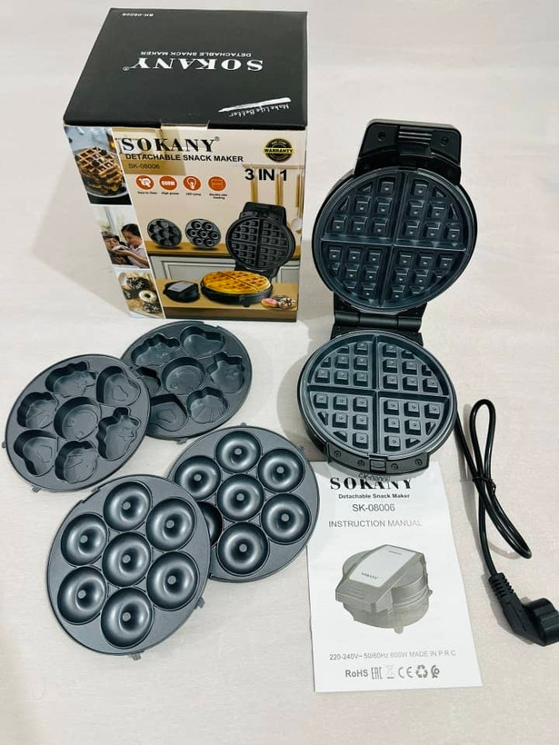 وافل ساز سه کاره سوکانی دارای سه صفحه برای وافل دونات و اشکال مختلف شیرینی توان 600وات پوشش نچسب مقاومت در برابر گرما گیره بدنه پلاستیکی چسبانده جمع و جور و جمع بندی عمودی قابل حمل آسان برای تمیز کردن